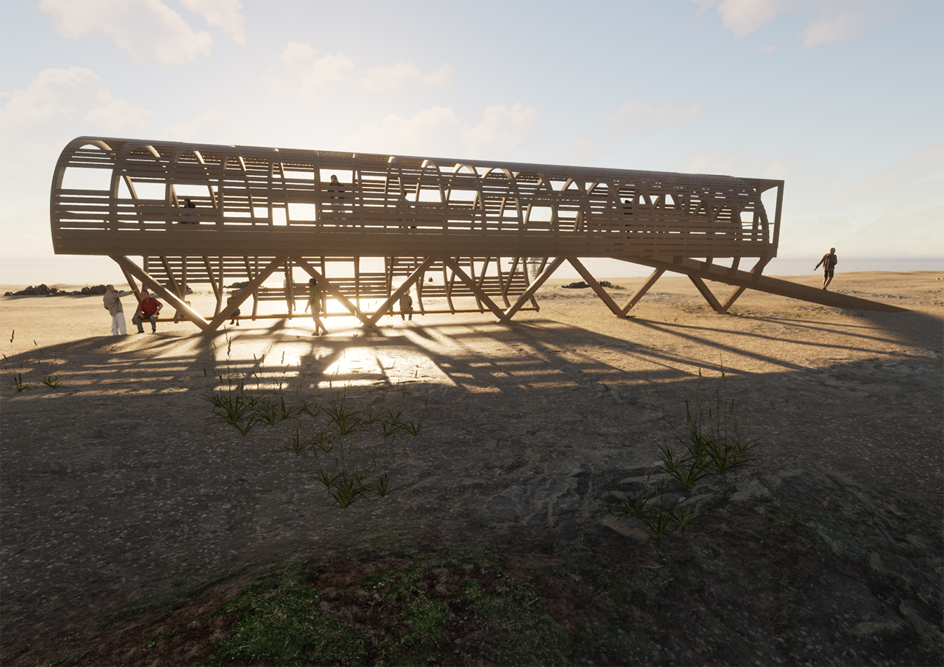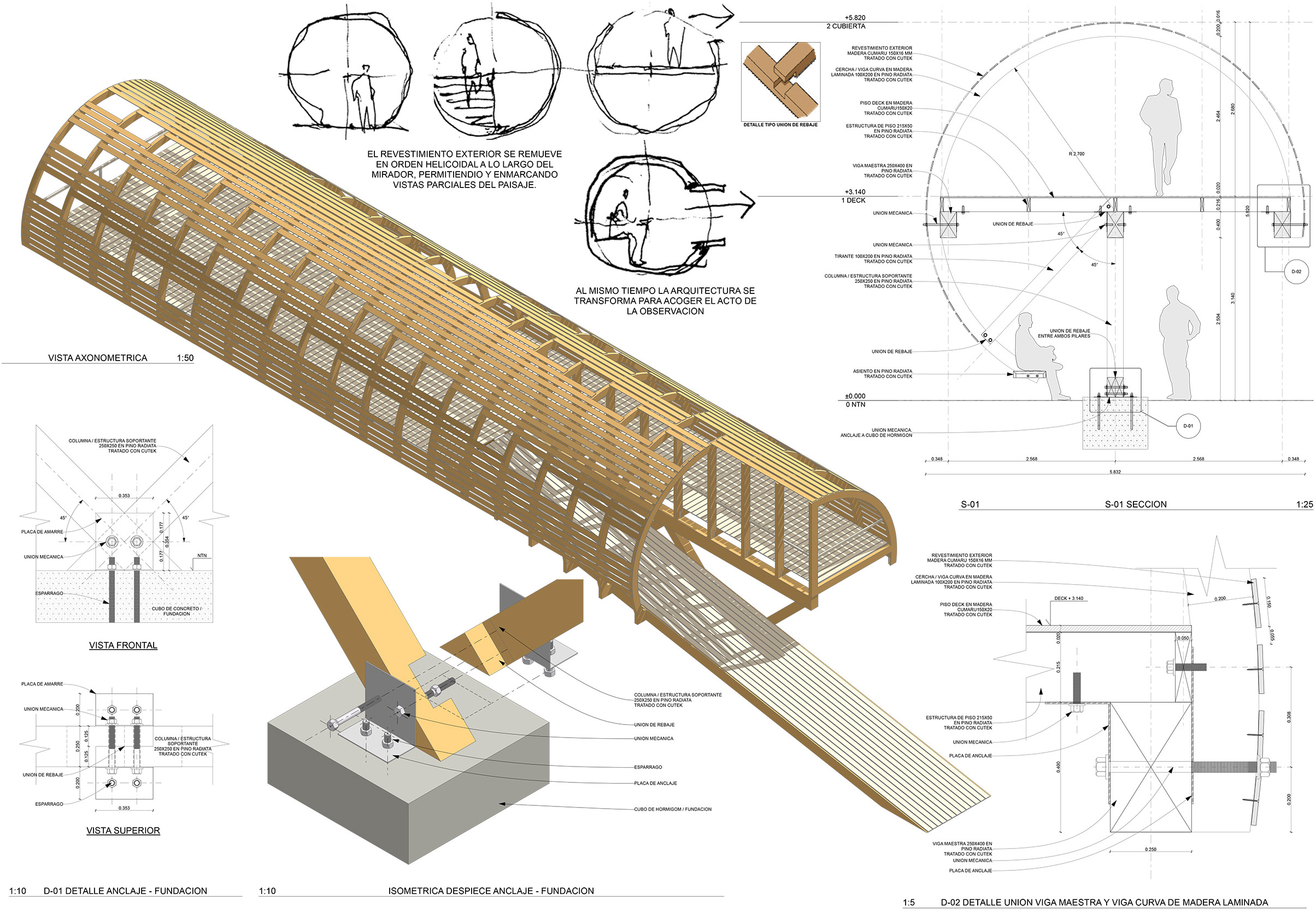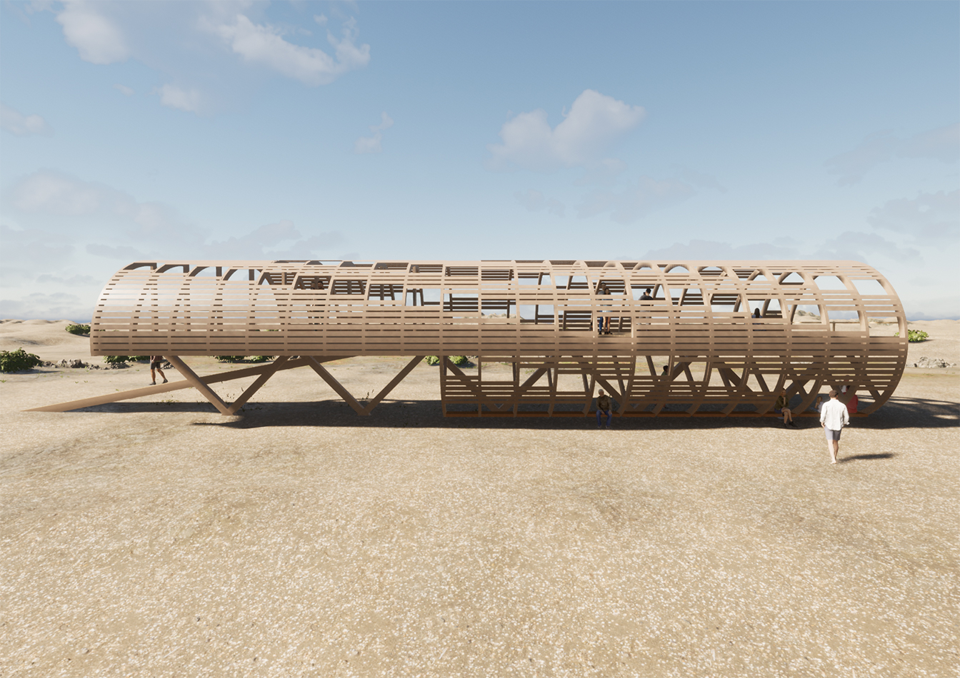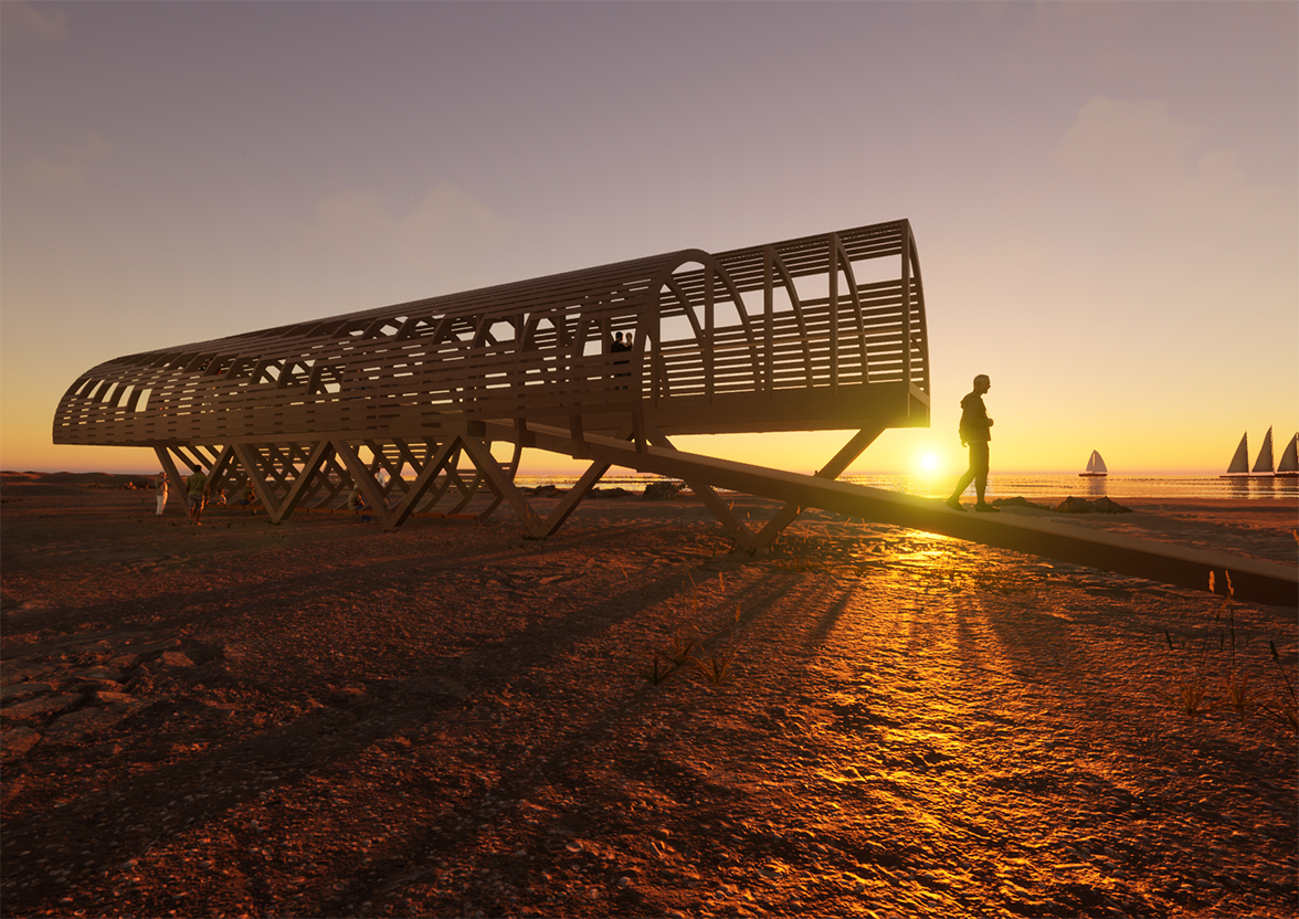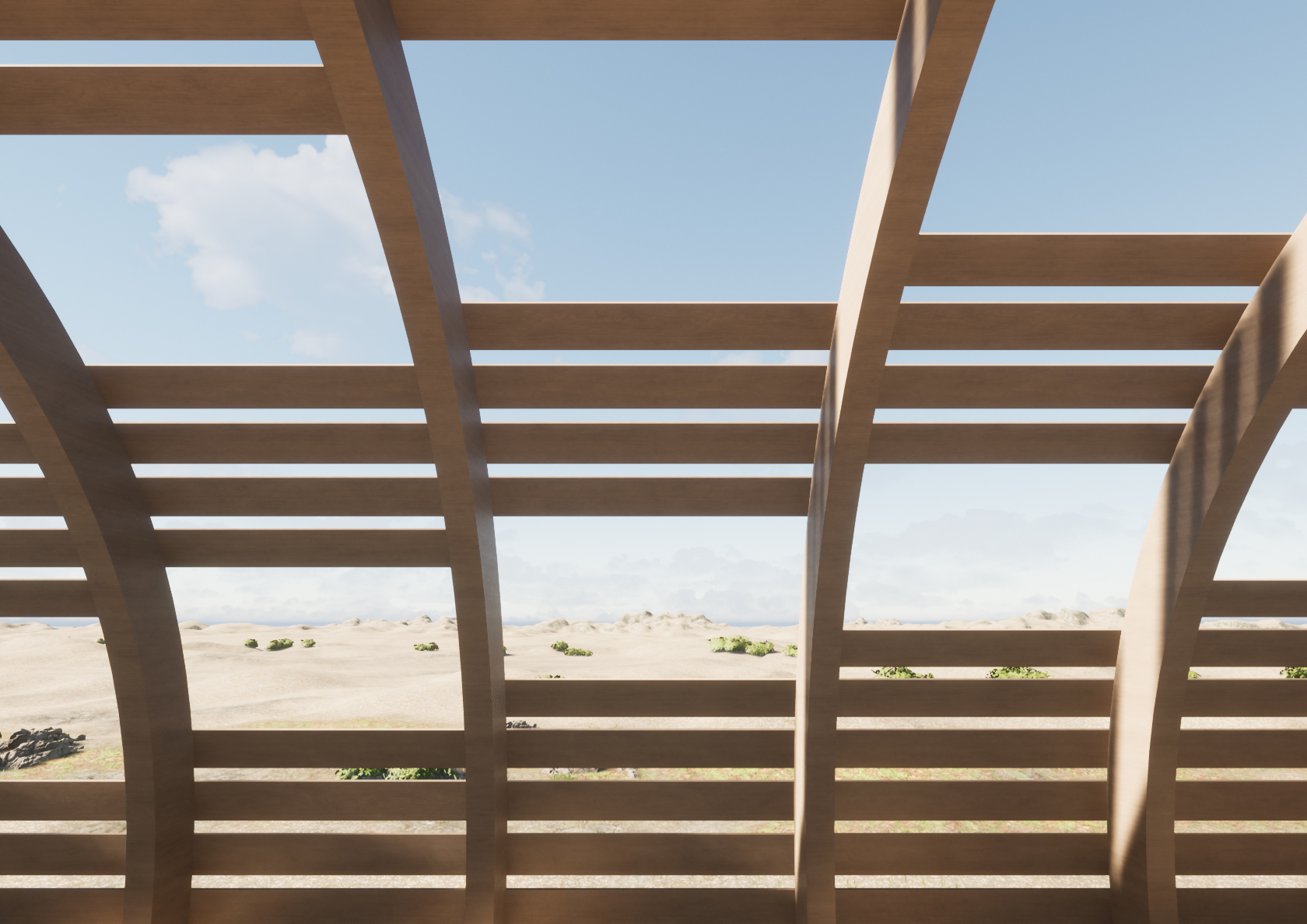– Timber structure that provides cover for the weather and the sun, at the same time it can be used as observation deck for the landscape and the nature of Bahia Salada framing partial views through the uncompleted timber slats shell.