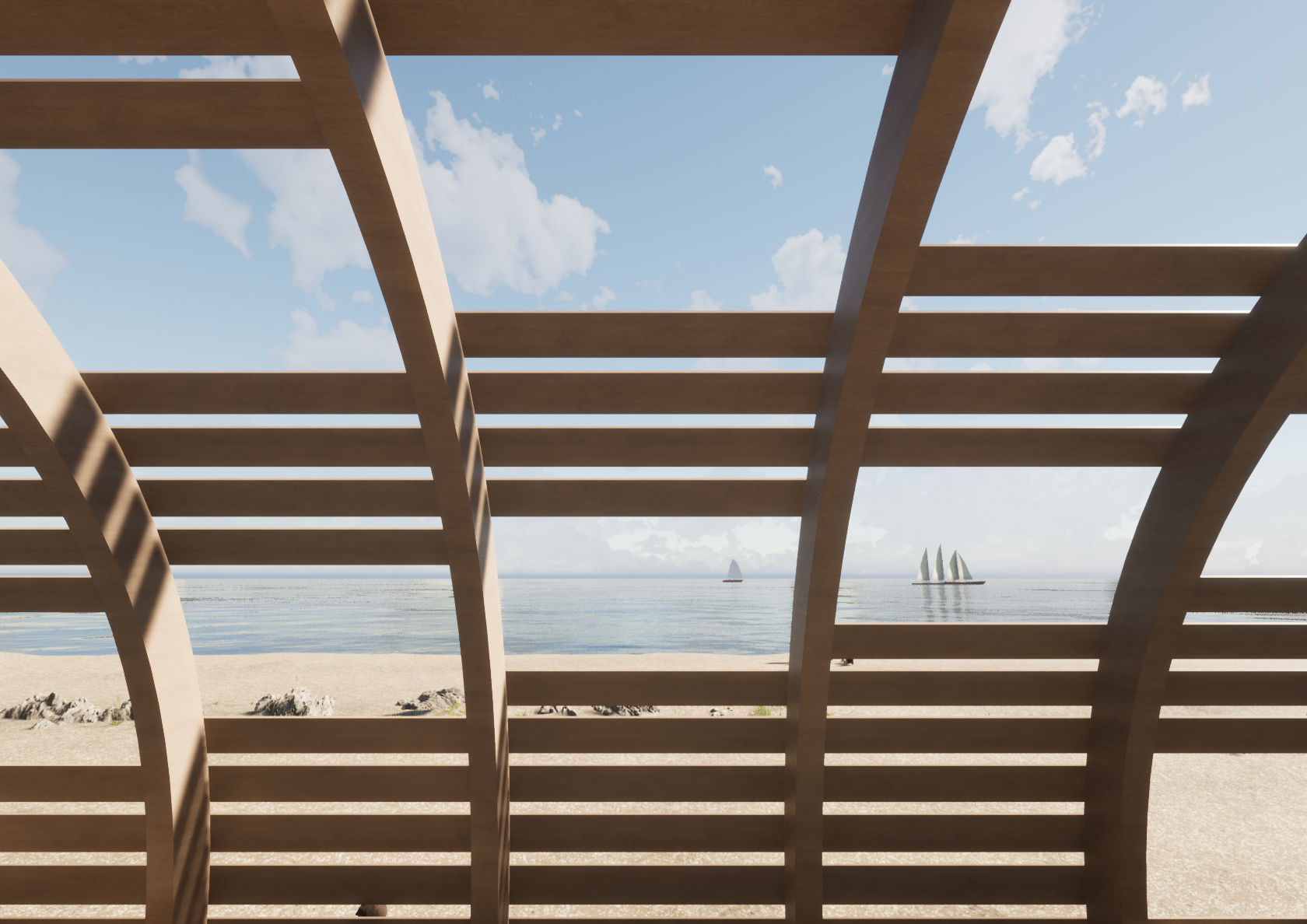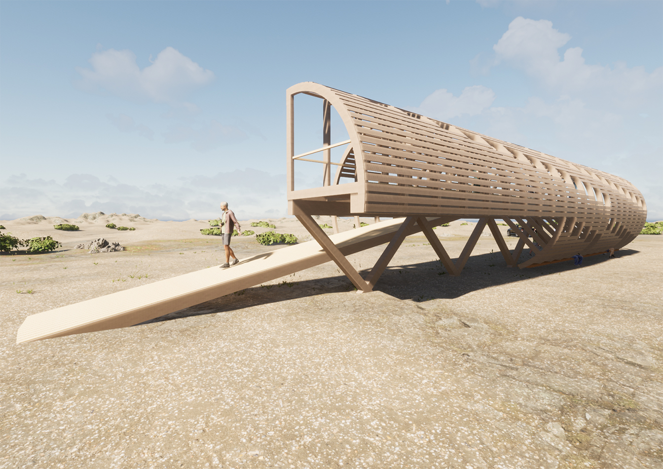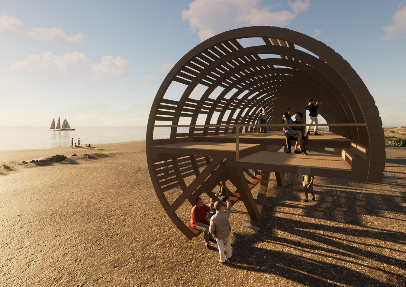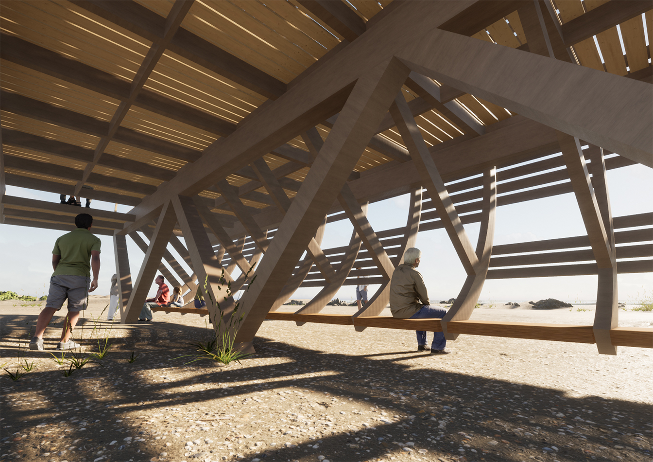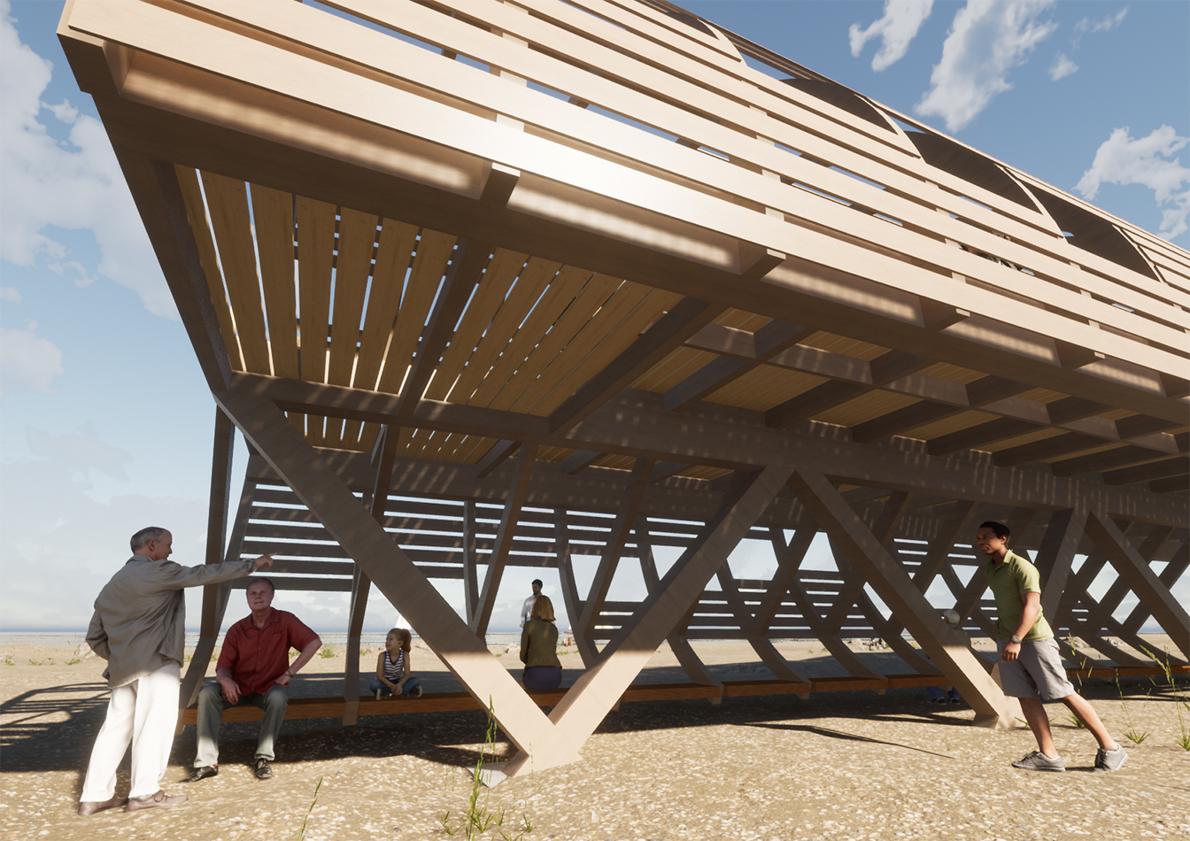 – Timber structure that provides cover for the weather and the sun, at the same time it can be used as observation deck for the landscape and the nature of Bahia Salada framing partial views through the uncompleted timber slats shell.