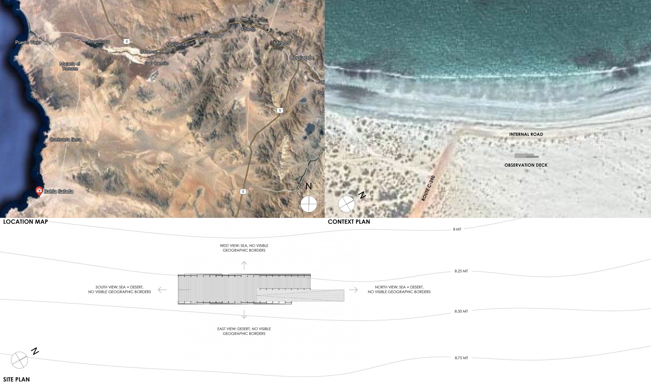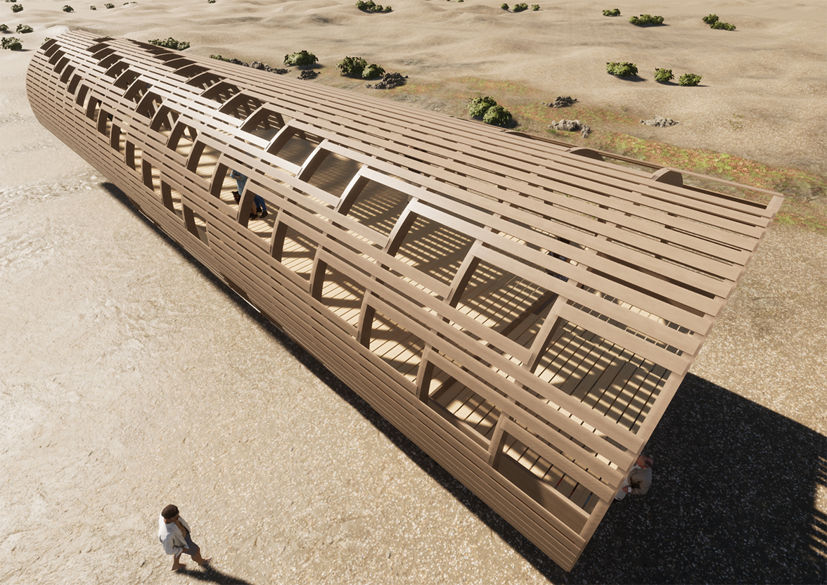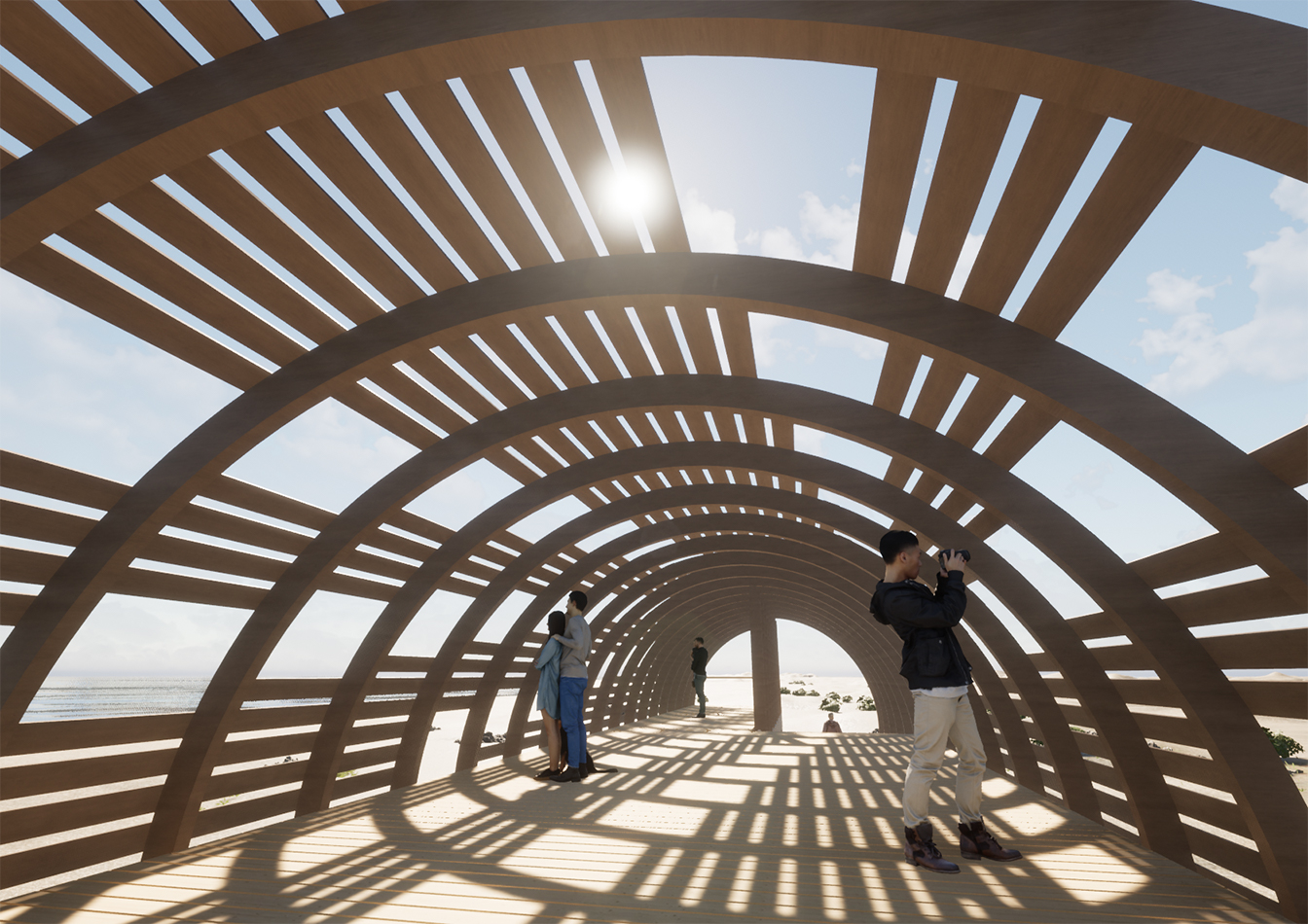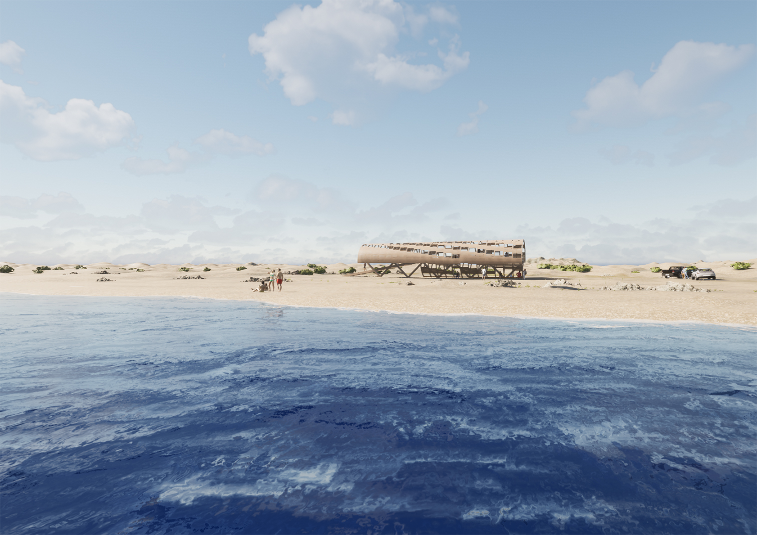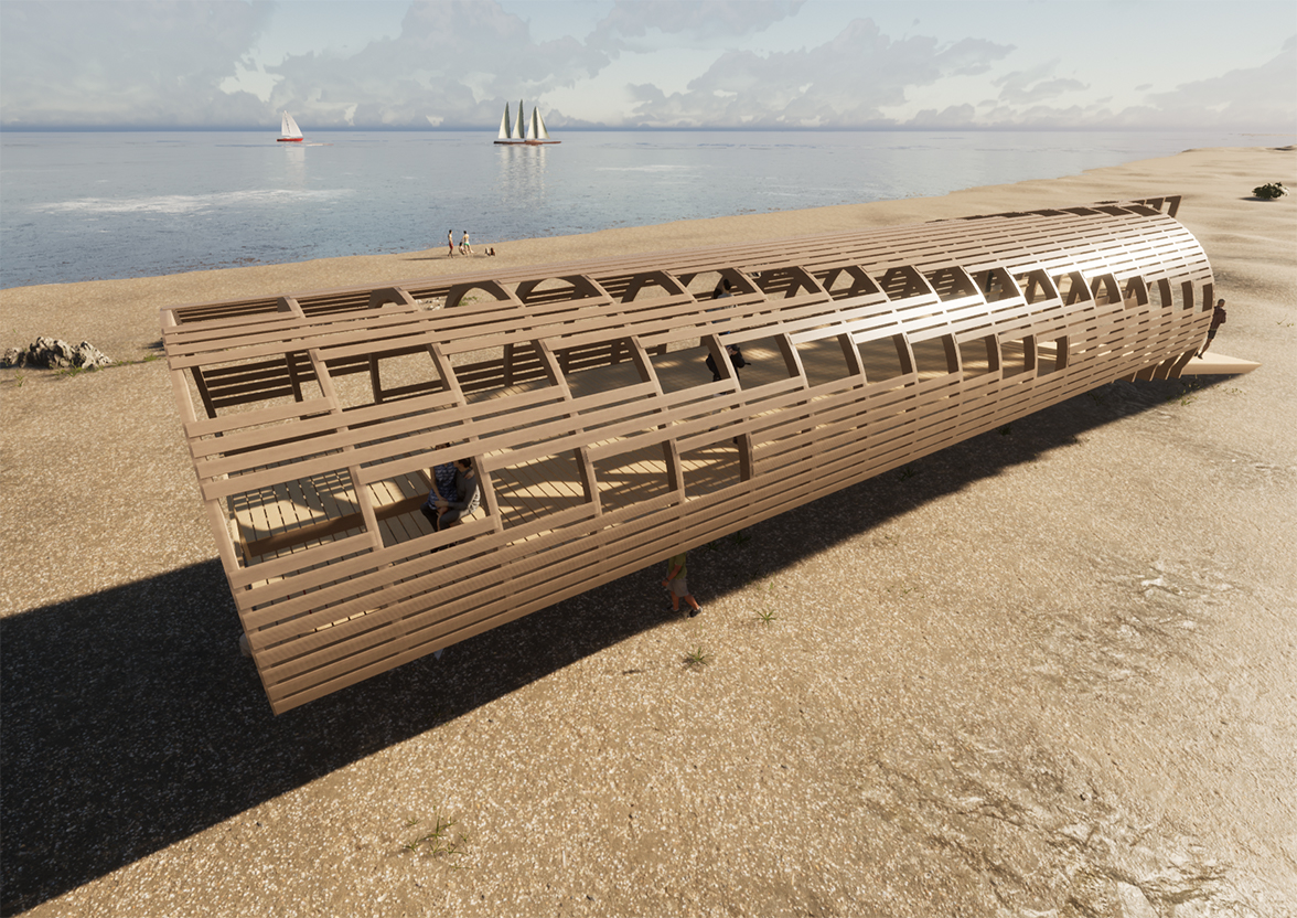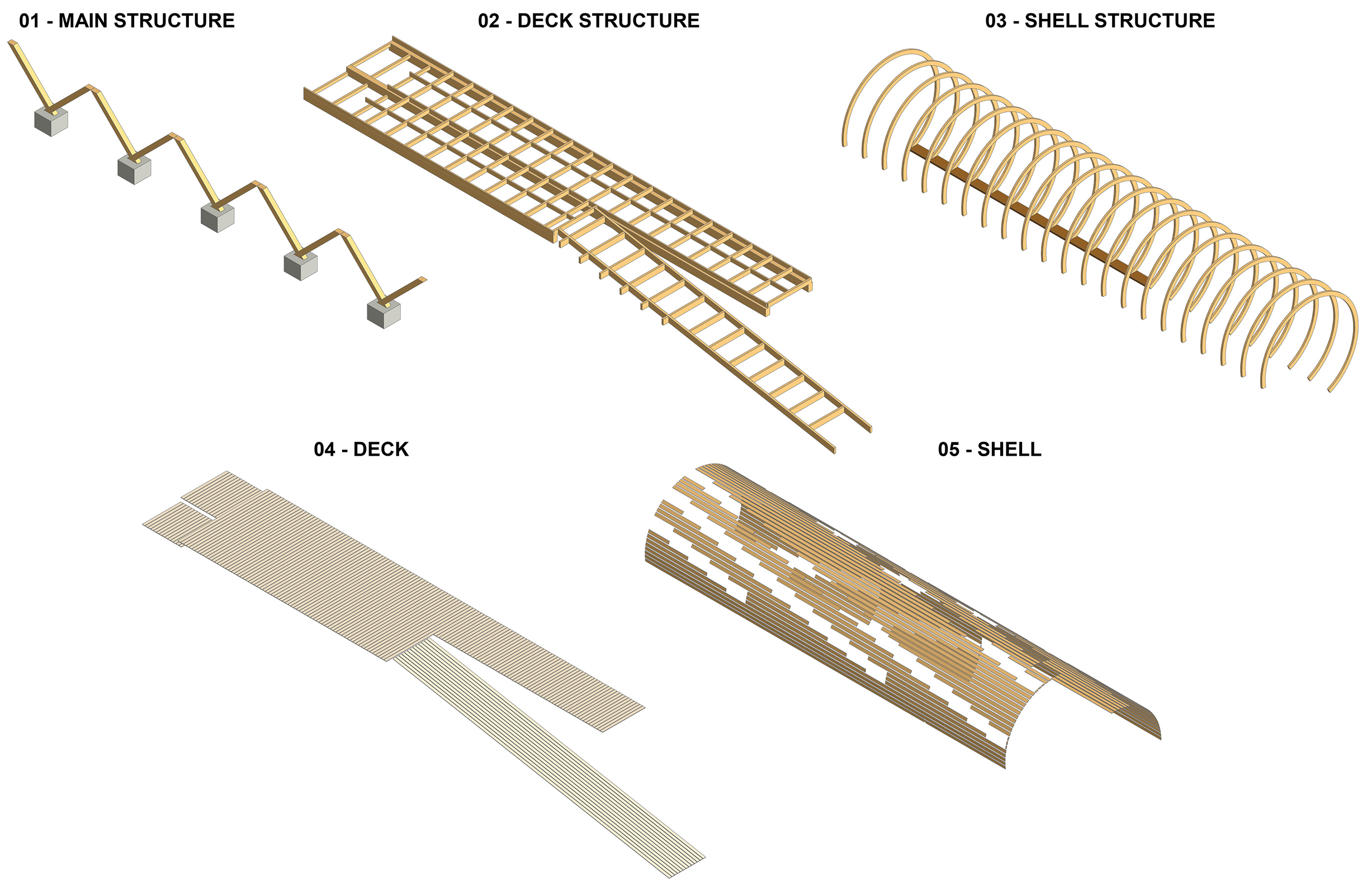 – Timber structure that provides cover for the weather and the sun, at the same time it can be used as observation deck for the landscape and the nature of Bahia Salada framing partial views through the uncompleted timber slats shell.